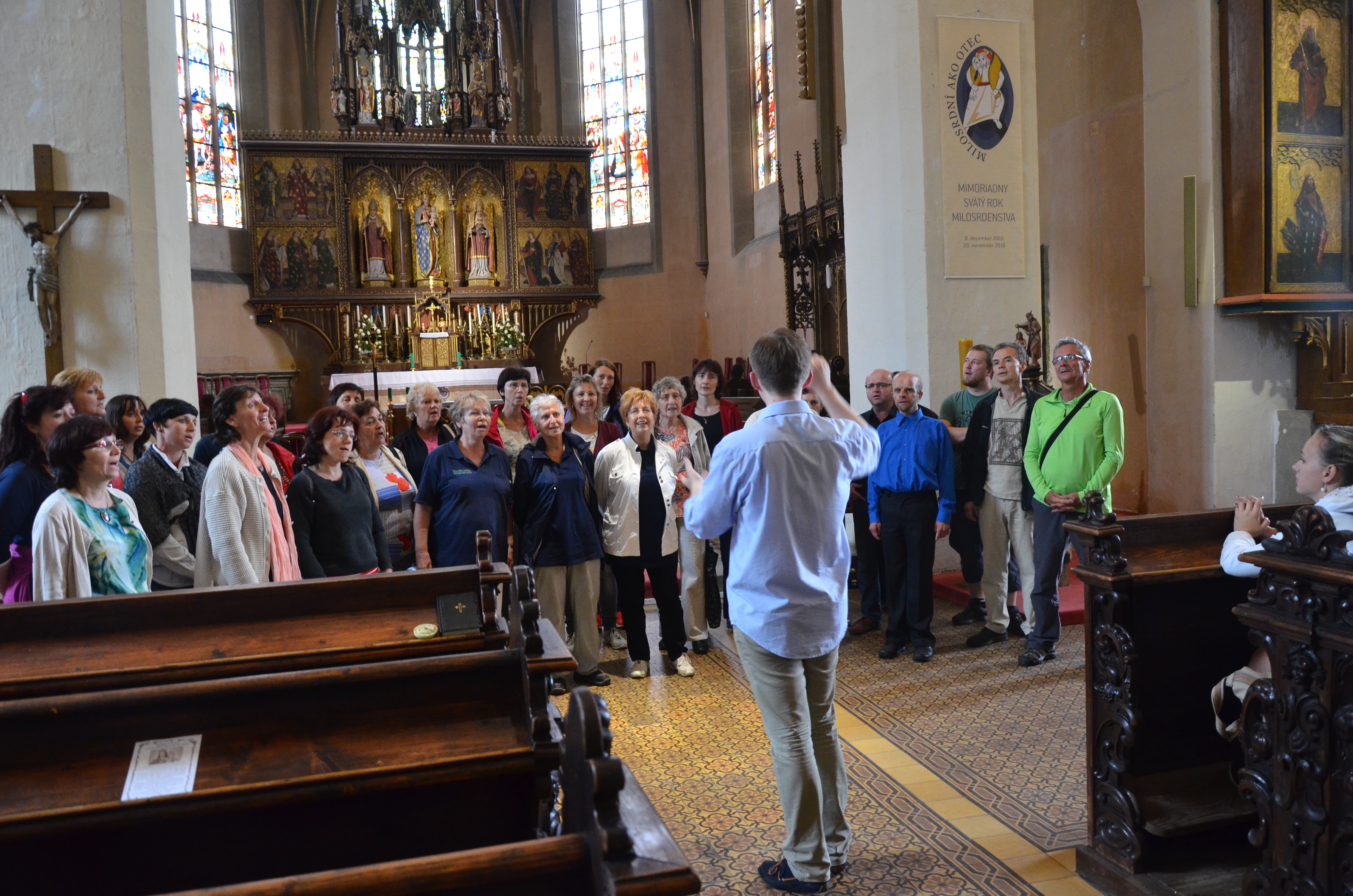V pátek 1.7.2016 jsme časně ráno vyjeli autobusem směrem k našim východním sousedům a první větší zastávku během dlouhé cesty věnovali prohlídce centra starobylé Levoče a především chrámu sv.Jakuba s překrásným oltářem Majstra Pavla z Levoče. Samozřejmě, že jsme si nenechali ujít příležitost zazpívat si v posvátných prostorách s tak úžasnou akustikou…
